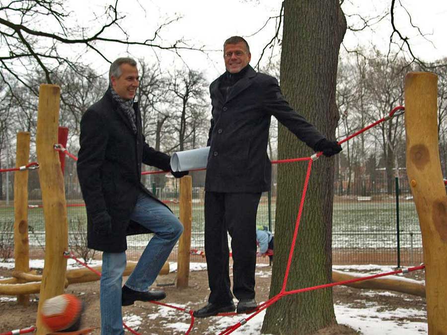 Eichwalde. Einen neuen Kinderspielplatz übergaben am Mittwoch (1.12.2010) Bürgermeister Bernd Speer zahlreich erschienenen Kindern. Mit dabei war sein Schulzendorfer Amtskollege Markus Mücke. Trotz Eiseskälte herrschte große Freude bei den jüngsten Eichwaldern. Der neue Kinderspielplatz mit attraktiven Spielgeräten für Kinder bis zu zehn Jahre liegt in unmittelbarer Nähe des Eichenparkstadions in der Gerhart-Hauptmann-Allee.